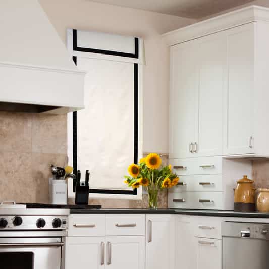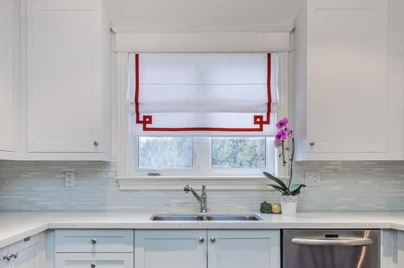 A low maintenance window treatment made from faux linen fabric is ideal in this case. This type of hypoallergenic polyester fabric is specially designed to keep its high-quality look for a long time, no matter how many times you wash it. This modern type of covering is best suited for a busy kitchen because it isn’t attacked by mold and doesn’t retain moisture, which are risk factors in such a space. Choose a clean, chic Roman shade and add a splash of color to your kitchen. This Greek key design at the corners will add a subtle twist to a classic decor, among many designs and styles you can choose from.
