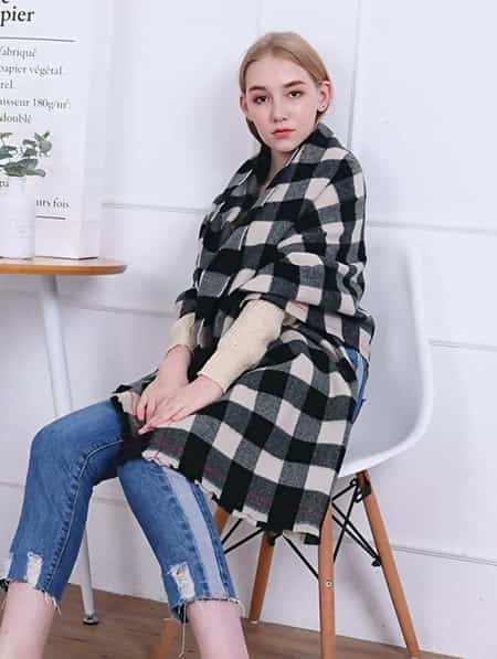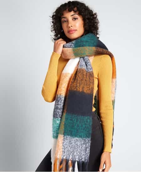 This cozy, plaid scarf styled around your shoulders will definitely leave you feeling warm all day long: